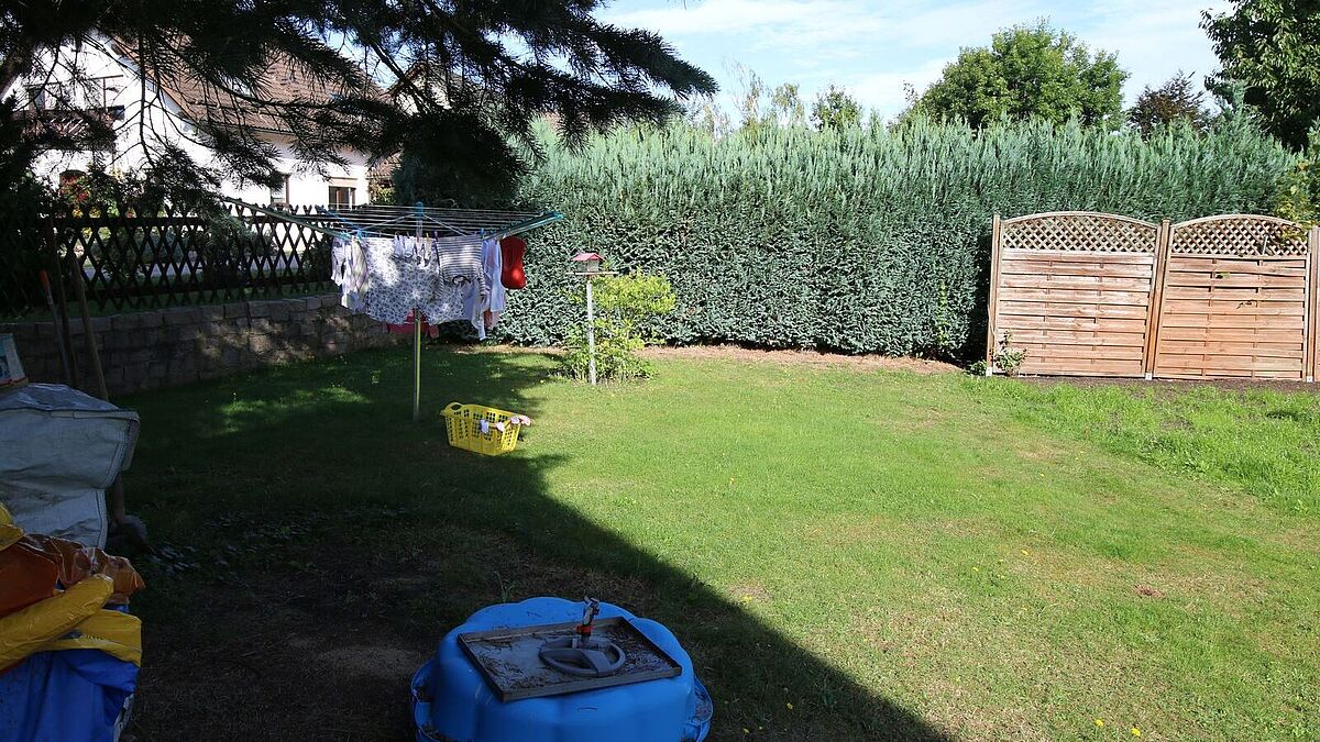 Über einen Außenzugang des Wohnzimmers ist die großzügige Terrasse erreichbar. Die vorhandene Grünfläche des Grundstückes wird als Gartenland genutzt.